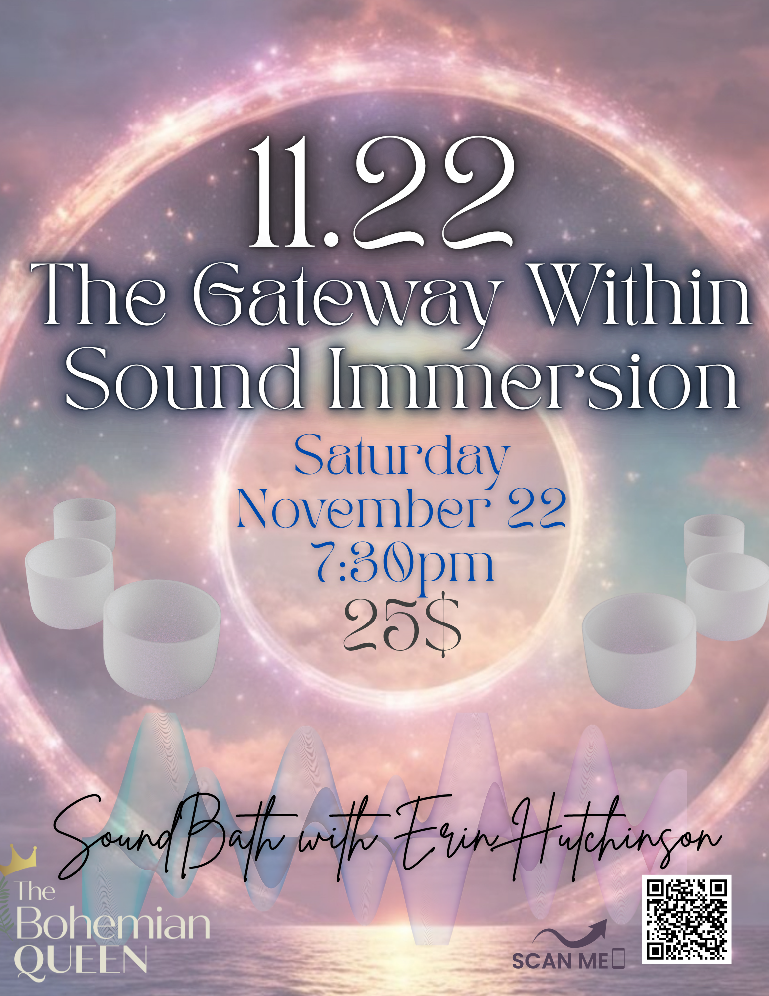 Step into the powerful 11.22 portal... a cosmic gateway for awakening, alignment, and transformation. This evening experience invites you to dive into your divinity through an immersive sound bath and guided meditation, designed to help you relax deeply, release what no longer serves, and reconnect with your higher self.