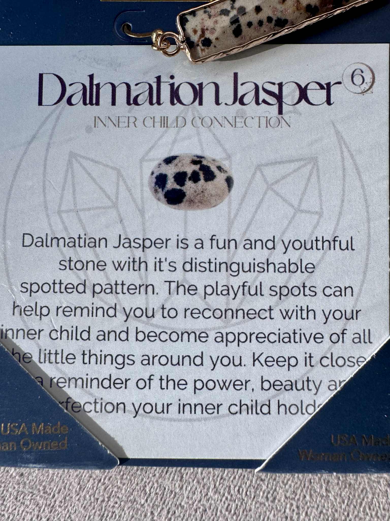 Worn as earrings, Dalmatian Jasper sits near the head and heart, promoting clear thinking, emotional stability, and cheerful self-expression throughout the day.